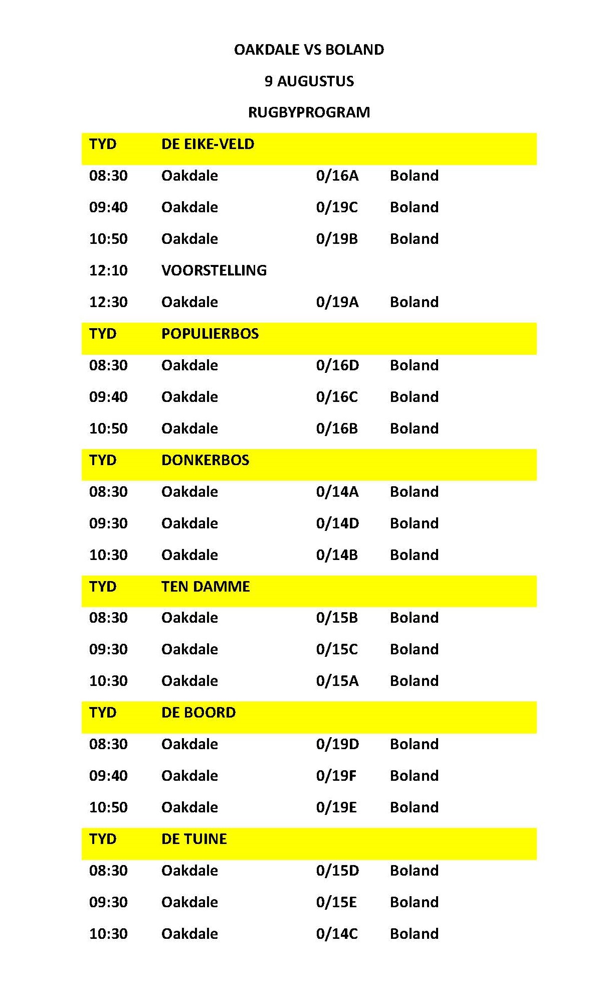 ‘n Hoogtepunt op die Vrydag kalender is die oudskoliere se wedstryd wat om 16:30 op De Eikeveld plaasvind, terwyl die Oakdale / Boland mammas mekaar die stryd aansê op die netbalbaan om 14:00 in die sportsentrum.