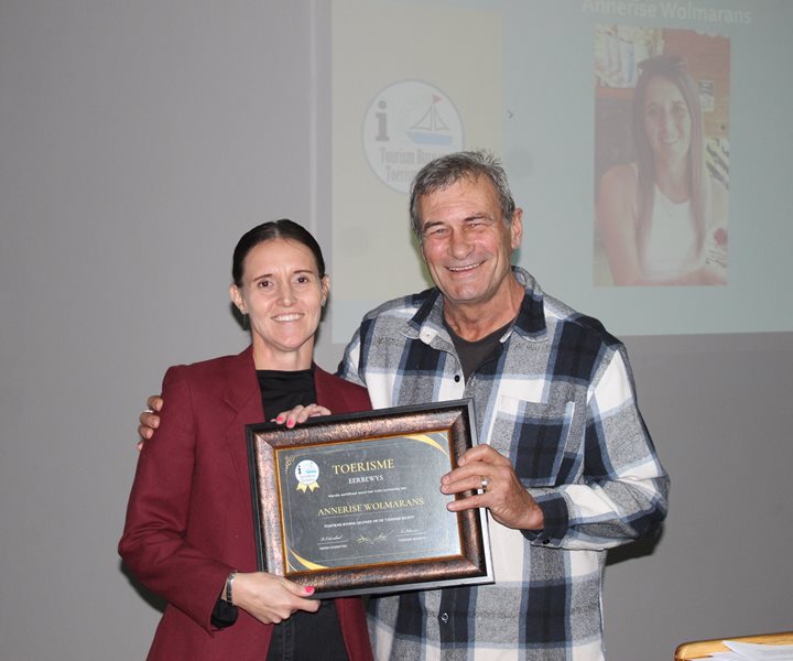 STILBAAI NUUS - Derek Odendaal, ondervoorsitter van Stilbaai-toerisme het Dinsdagaand, 26 Augustus, tydens die algemene jaarvergadering, 'n oorkonde vir uitmuntende diens aan toerisme aan Annerise Wolmarans, voorsitter van Stilbaai-toerisme, oorhandig.