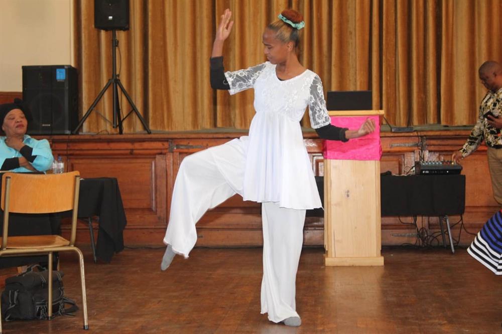 Farren Vergotine van Mosselbaai besig met haar geestelike danspassies.