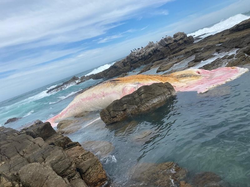 Die walvis het ongelukkig op 'n onbegaanbare plek vir voertuie op die rotse uitgespoel en om dit te verwyder is 'n baie moeilike operasie.